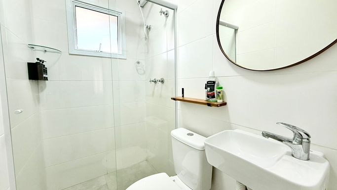 Condomínio oferece: Piscina, sauna, uma vaga de garagem coberta com portão automático.