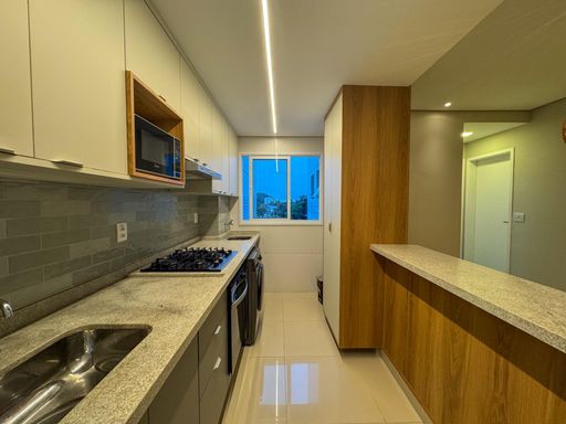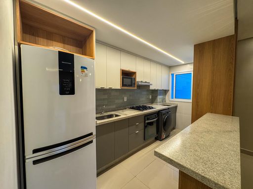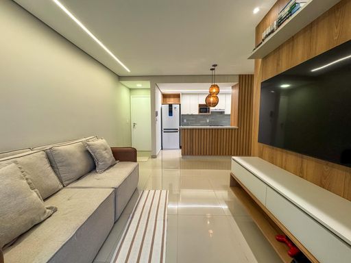 Apartamento mobiliado para locação anual, com 2 dormitórios, sendo 1 suíte, varanda gourmet e condomínio com área de lazer e piscina.